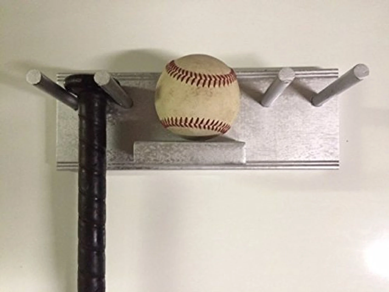 All Purpose – Multi Use Storage Rack Hardwood Wood – Silver Finish Rack can hold 2 Bats or Sticks and 1 Ball Can be used for baseball or softball bats – lacrosse sticks – tennis rackets measures approx. 10 1/4 inches X 3 3/4 inches Approx 1 inch thick