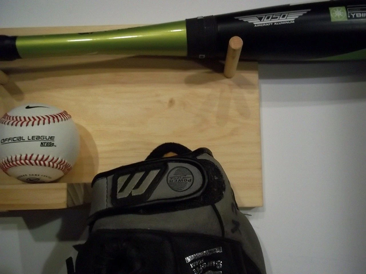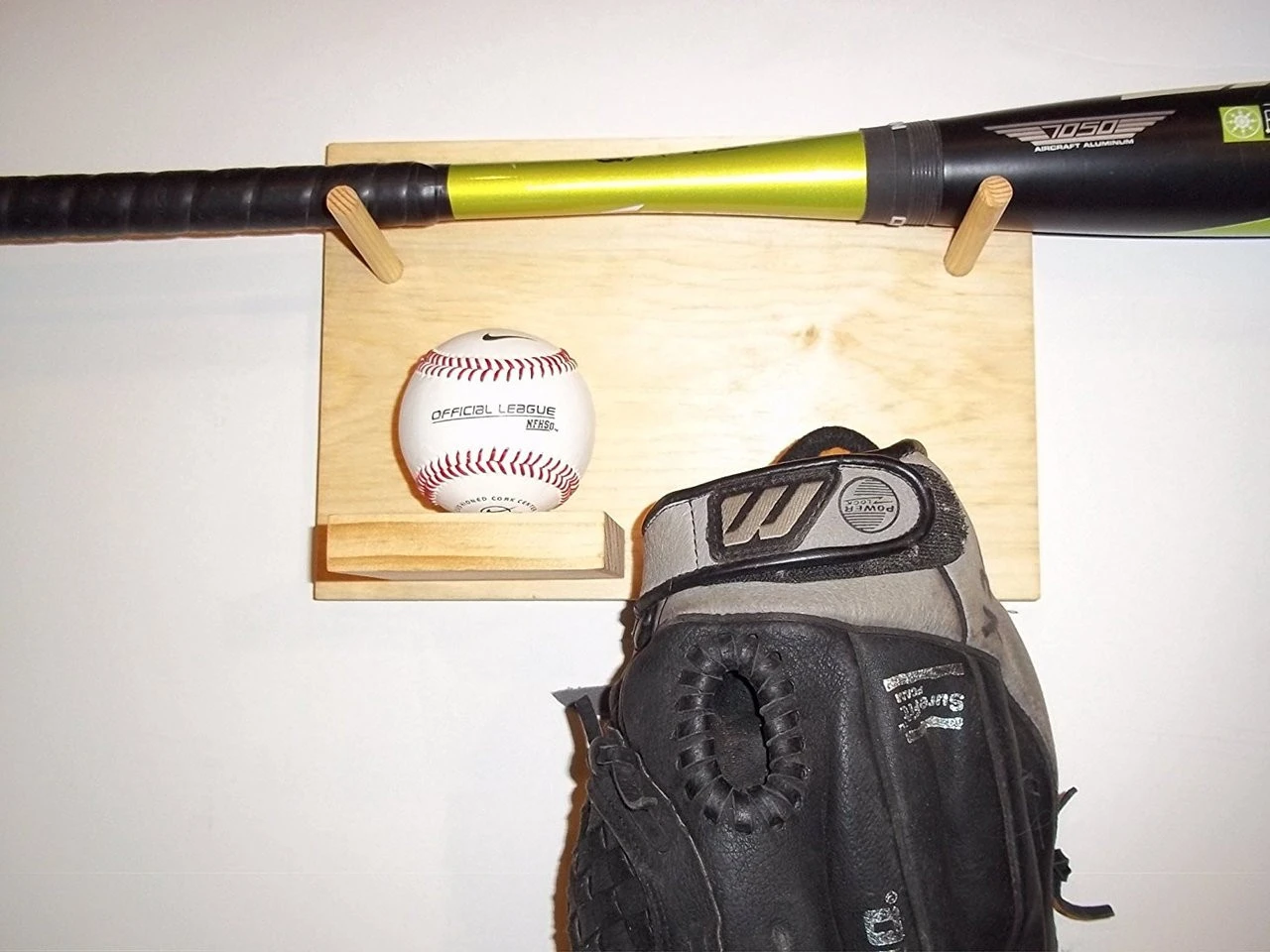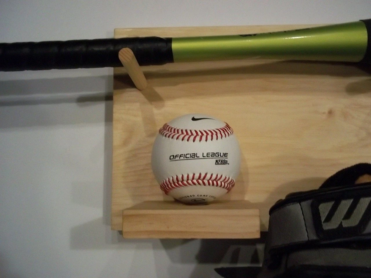 Wood Full Size Bat Ball Glove combination Storage Rack Natural finish Rack stores 1 full size bat ( lays horizontally) and has a shelf with a pre drilled indentation to store a baseball Large dowel for a baseball glove to hang from Measures approx. 11 x 7 1/4 2 pre drilled holes for hanging *** HARDWARE PACKET IS INCLUDED WITH YOUR PURCHASE*** Hand crafted – Made to order ***PLEASE CONTACT US FOR ANY WHOLESALE QUANTITIES OR ANY SPECIFIC SIZES THAT YOU MAY REQUIRE.***