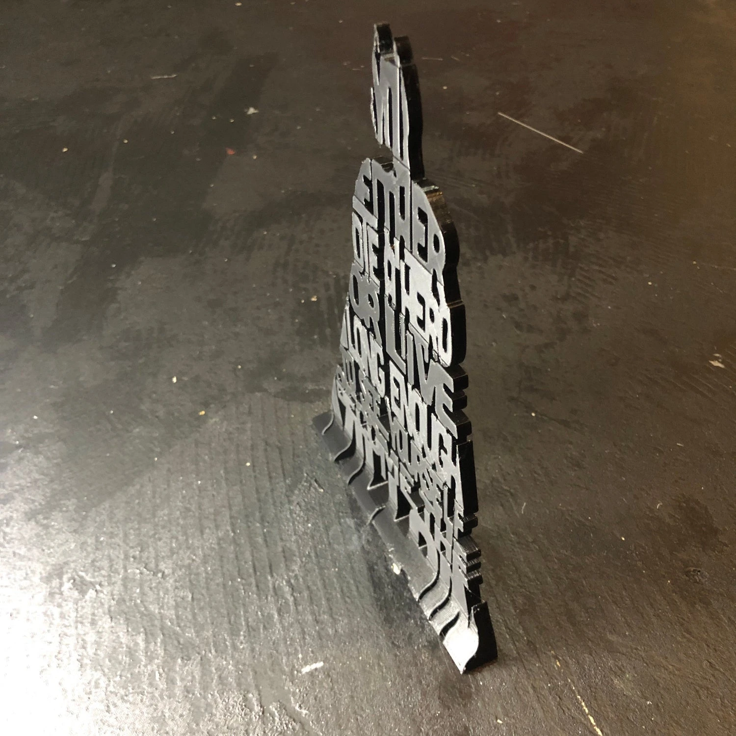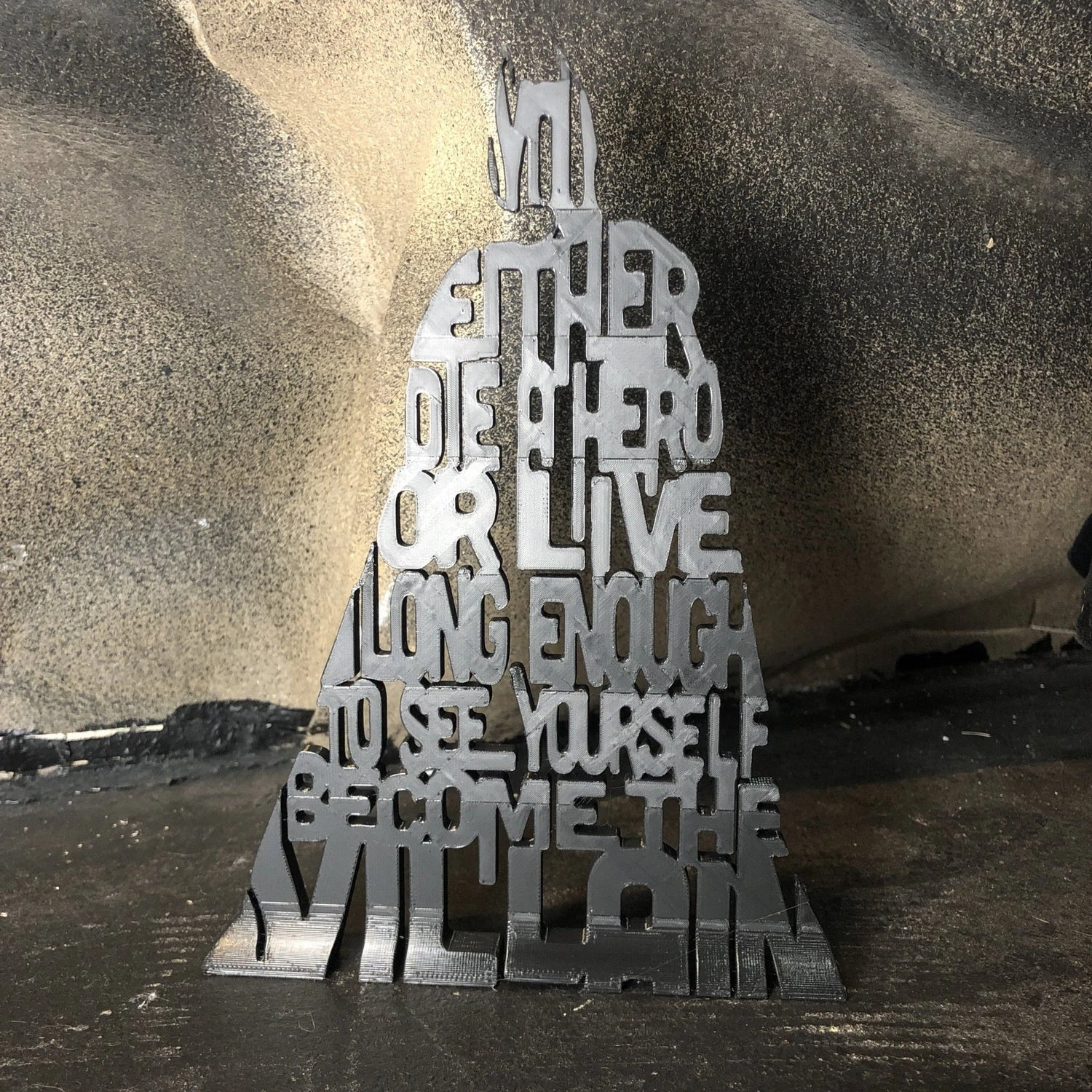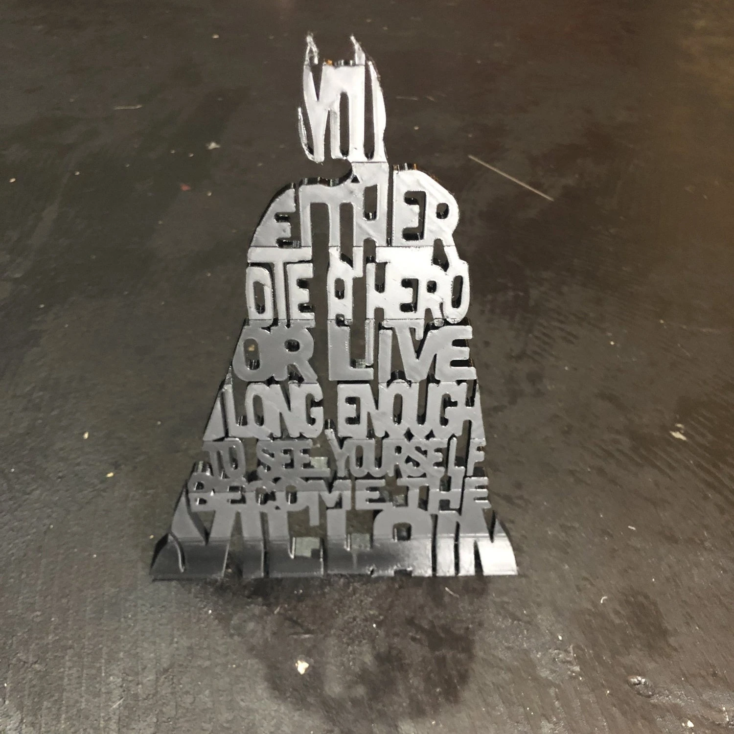 This iconic 3D printed Die a Hero or Become the Villain 3D Silhouette features those words in a silhouette of our hero. This item is always printed in black and stands on its own on a counter, table, or shelf. Makes an AMAZING gift for that Batman fan in your life, perfect shelf art or display item.