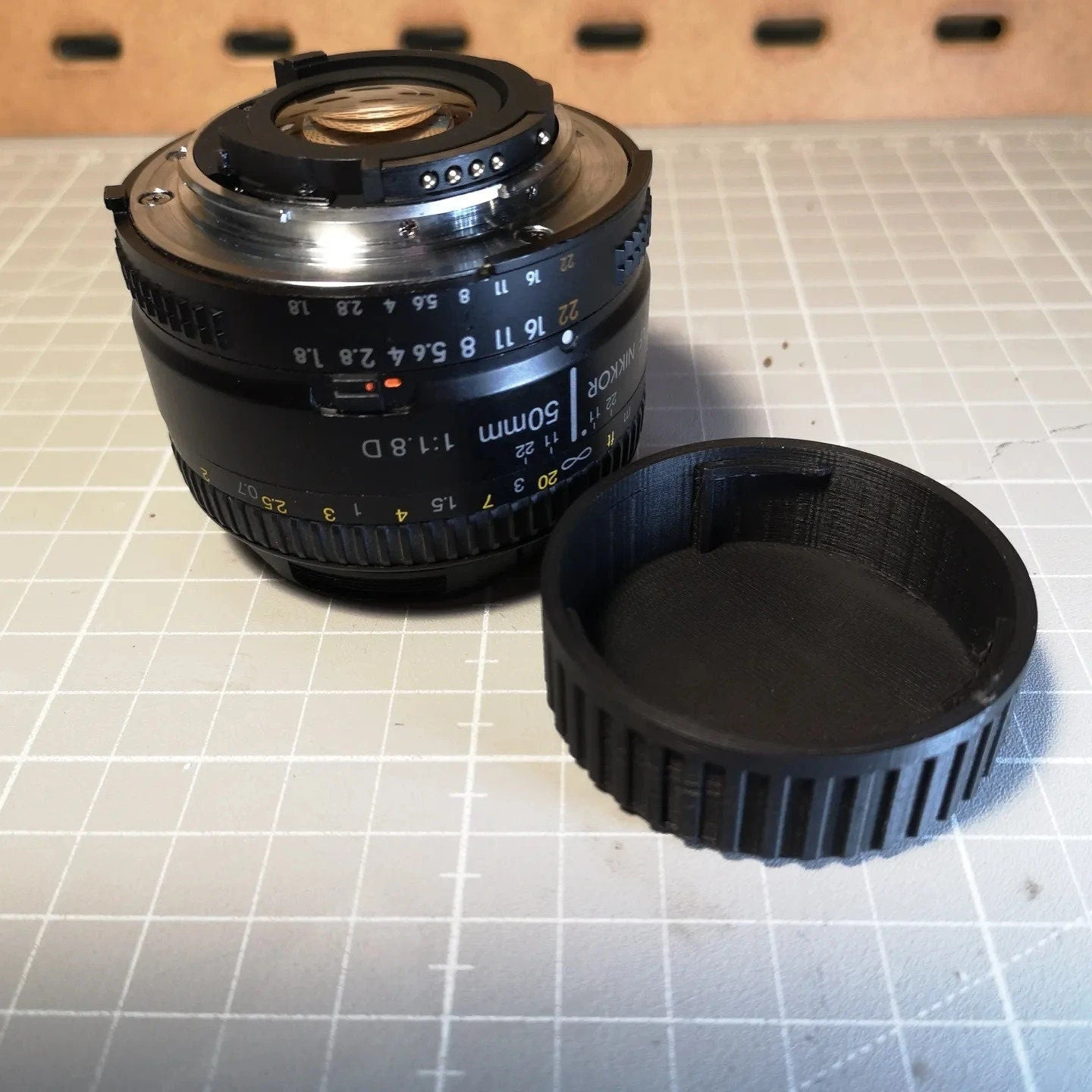 This is a 3D-printed Lens Cap for the Nikon F mount lens. 3D-printed in durable yet earth-friendly PLA, it should keep everything safe and sound and fits great! This worked for my AF Nikkor 50mm f1.8 D. Simple and efficient!
