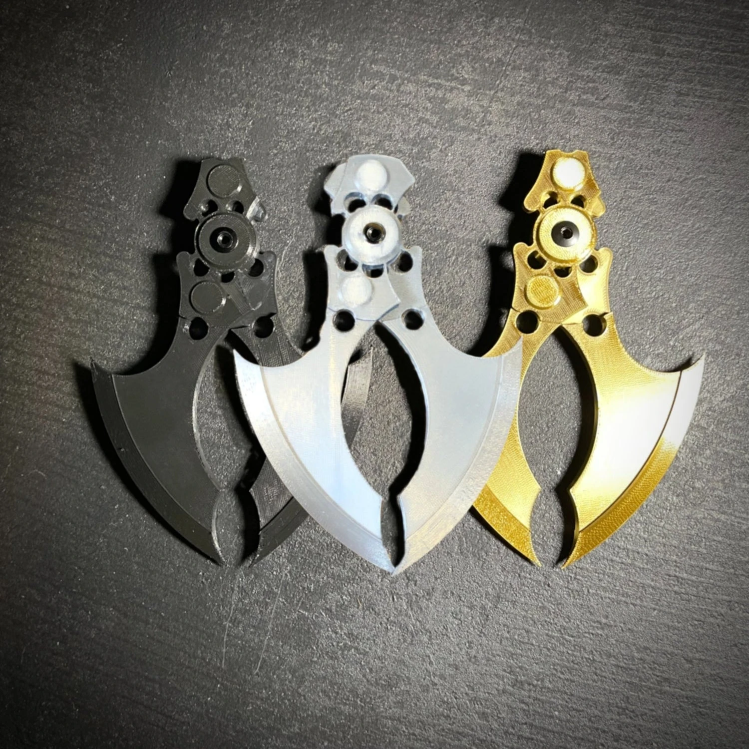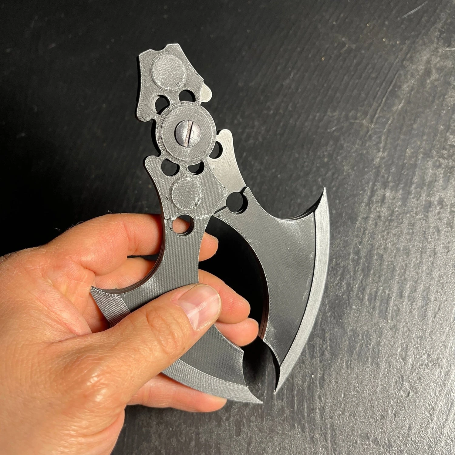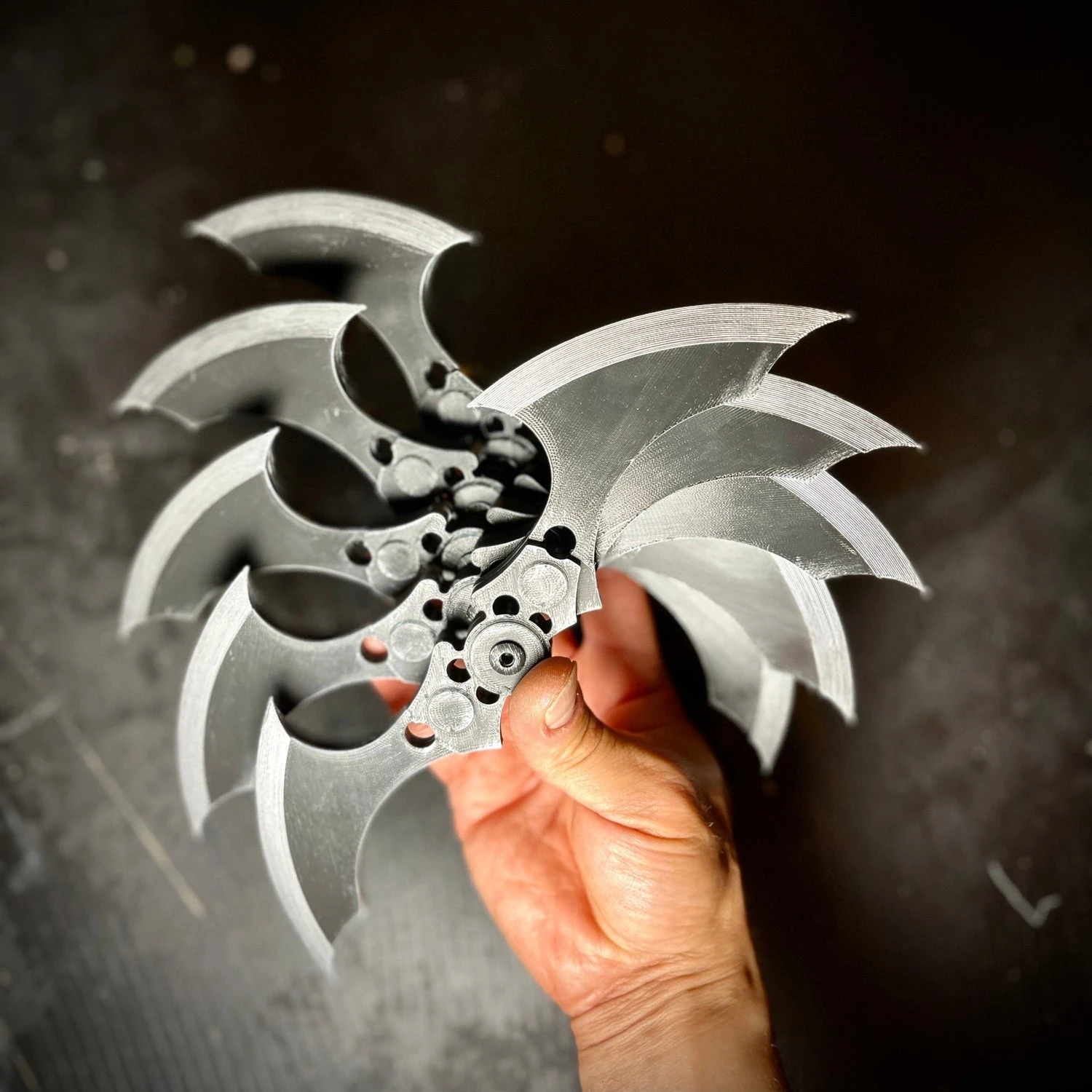 This 3D-printed plastic prop opens and closes and stays locked in either position using embedded neodymium (rare earth) magnets. With a slight flick of the wrist or push of a finger, the prop opens and locks into the open position. With another flick of the wrist, the prop closes!