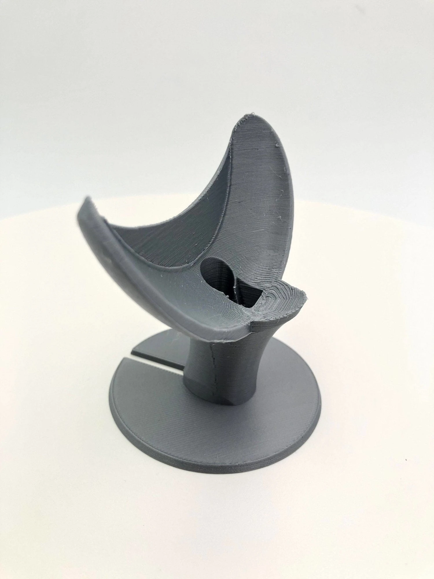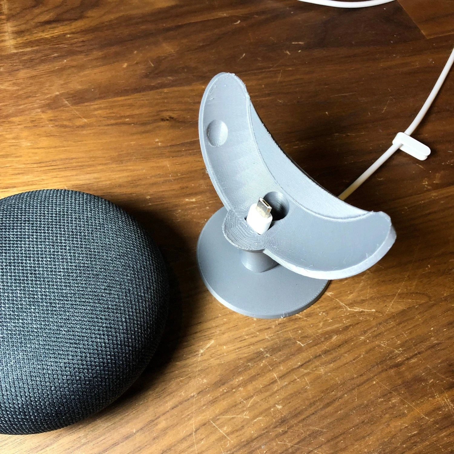 This is a 3D-printed pedestal angled stand/mount for the Google Nest Mini smart speaker. This is perfect for home organization and getting that speaker up off of the table or counter, and projecting music or news throughout your home! Holds the speaker upright and angled out into the room, and manages the cord really nicely throughout the design.