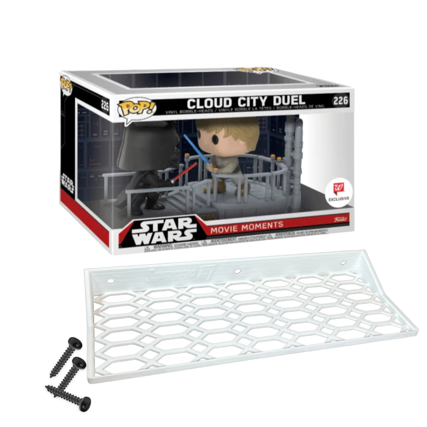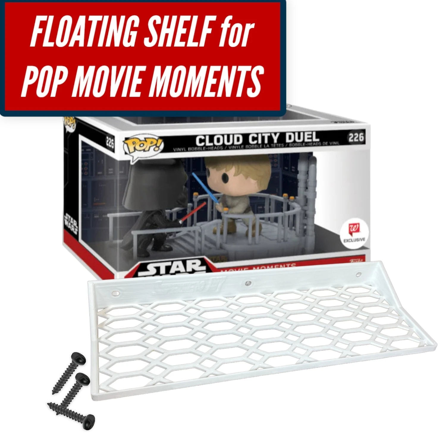 This is a Hex Wall Mount for Funko Movie Moments Boxes that can be easily mounted to your wall for a great-looking Funko display with the included small mounting screws (three per shelf) for wall display. We recommend small screws for the weight of Funko Movie Moments — and you might even want to go buy bigger screws with anchors (not included) if ours aren’t enough.